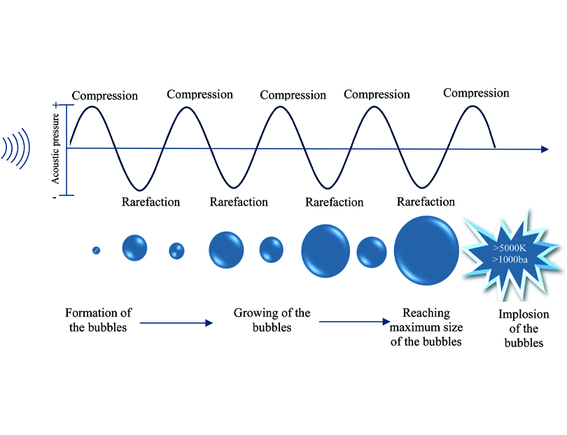 การเกิดคลื่นอัลตร้าโซนิค เกิดจากการส่งคลื่นความถี่สูงมากกว่า 20 kHz ผ่านของเหลว เช่นน้ำ สารละลาย ทำให้เกิดรอบความดันสลับกัน สูง-ต่ำ ส่งผลให้เกิดฟองอากาศขนาดเล็ก (Nuclei) และฟองอากาศจะเกิดการยุบตัวและขยายตัวอย่างรุนแรง (Implosion) ปล่อยพลังงานความร้อนและแรงดันมหาศาล การยุบและขยายตัวซ้ำ ๆ เราเรียกว่า Cavitation ...
